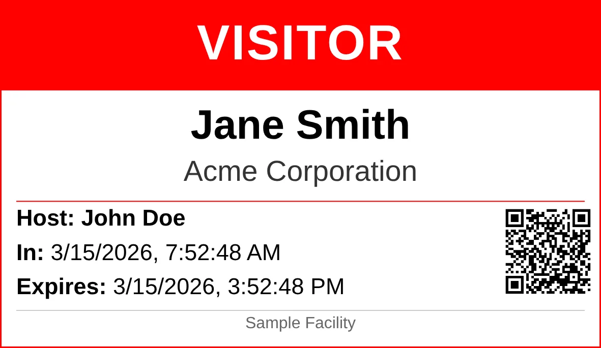 Name, company, host, and visit reason. Perfect for offices and coworking spaces.